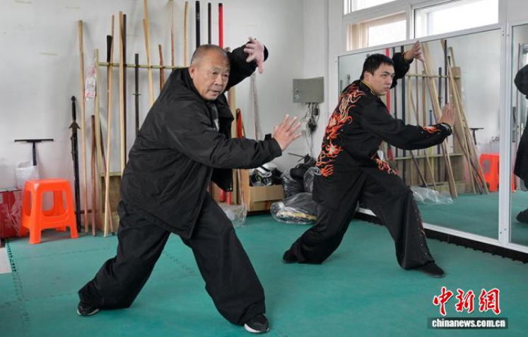 2025年12月2日,山东莱阳,李飞林(左)向徒弟传授螳螂拳实战招式。刘昊 摄△