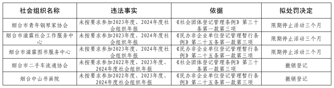 烟台市民政局《行政处罚决定书》送达公告(限期停止活动三个月、撤销登记)