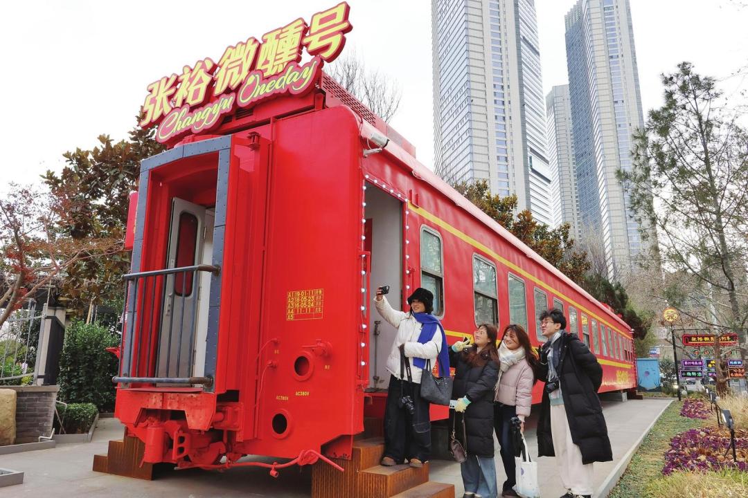 1月2日,在烟台张裕酒文化博物馆,游客在由退役车厢改造的“张裕微醺号”火车餐厅拍照。元旦小长假期间,市民和游客在烟台用各种各样的方式放松休闲,乐享假期。 记者 唐克 摄