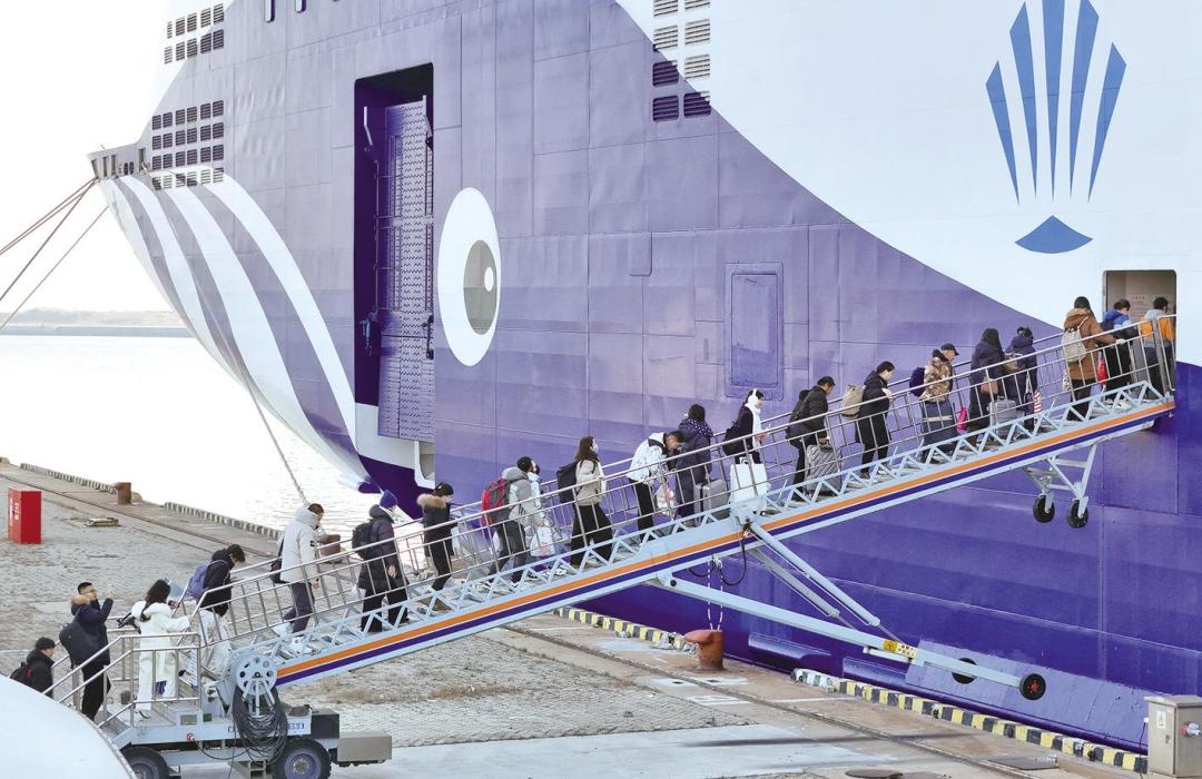 昨天是元旦假期最后一天,烟台各交通枢纽迎来返程客高峰。图为旅客在山东港口烟台港乘船前往大连。 记者 唐克 摄