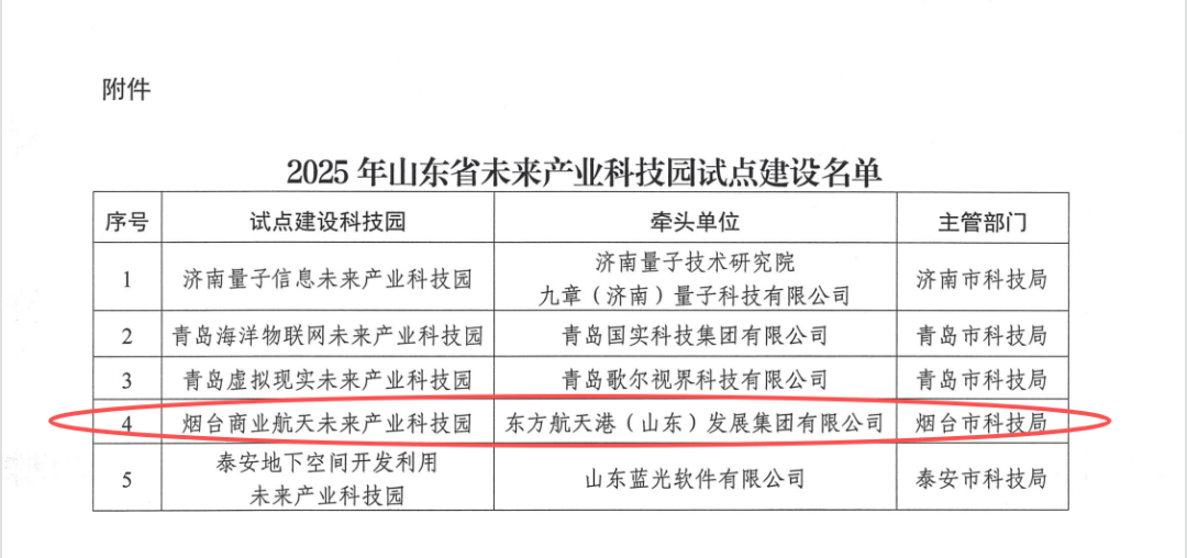 近日,山东省科学技术厅发布《关于批准开展山东省未来产业科技园试点建设的通知》,决定在全省范围内批准开展5家未来产业科技园试点建设。其中,海阳市东方航天港(山东)发展集团有限公司建设的“烟台商业航天未来产业科技园”成功入选,成为烟台市唯一获批建设的省级未来产业科技园试点。
