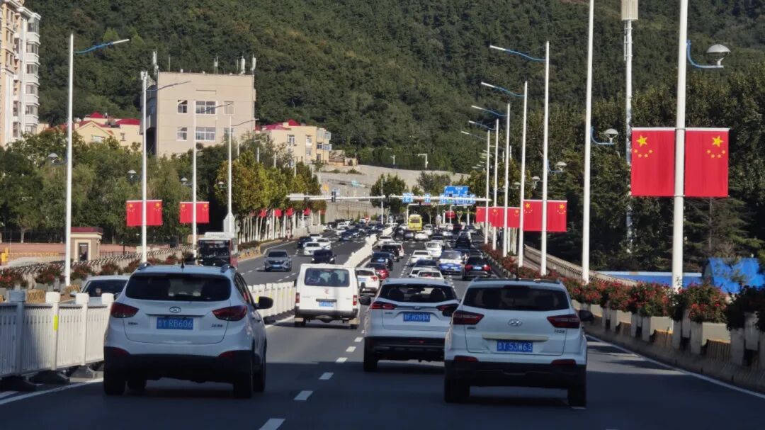 国庆期间,风格转为庄重热烈。全区14条主干道两侧,500余套五星红旗规范悬挂,每一面都经过精心调试,在秋日晴空下连缀成一道道壮观而庄严的“红色长廊”。