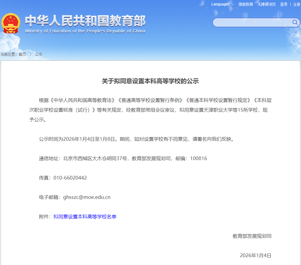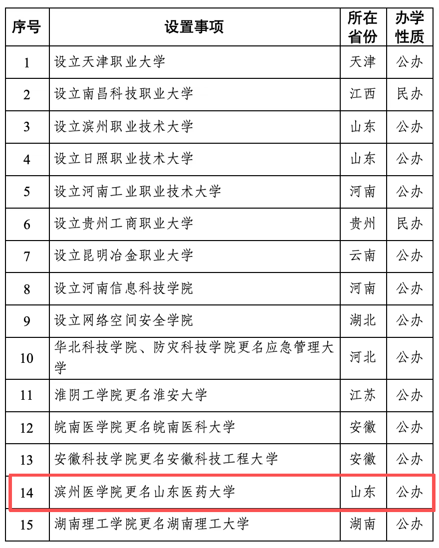 1月4日,教育部发展规划司发布关于拟同意设置本科高等学校的公示,其中包括滨州医学院更名山东医药大学。