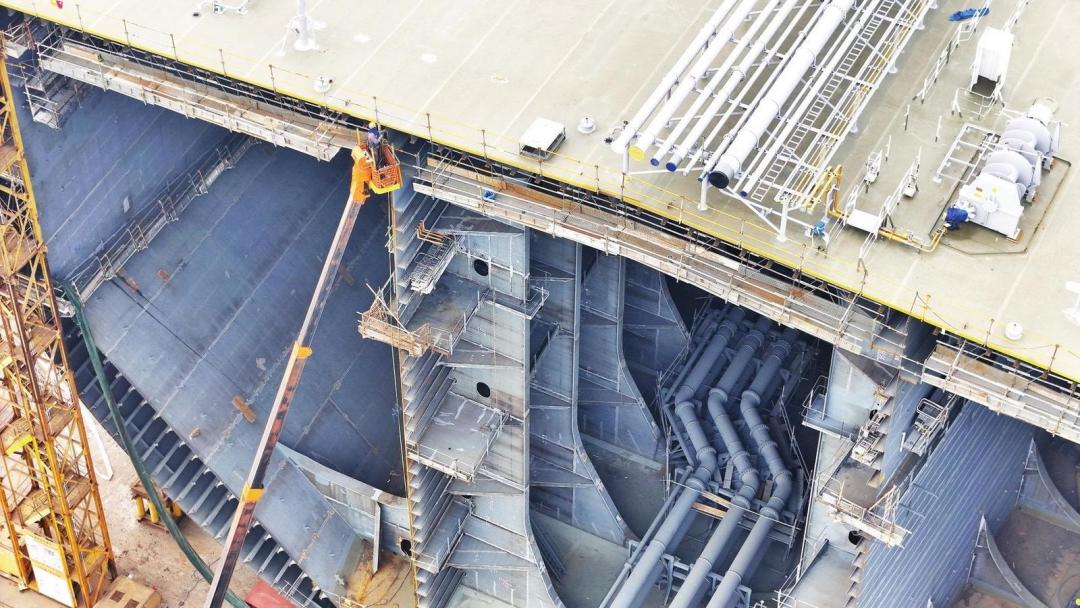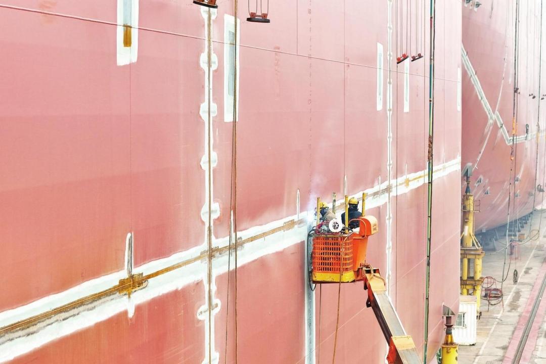 1月4日,在烟台黄渤海新区一家造船企业,工人在登高车上建造大型船舶船体分段。元旦过后,烟台各企业加紧生产,赶制订单,力争“开门红”。 记者 唐克 摄