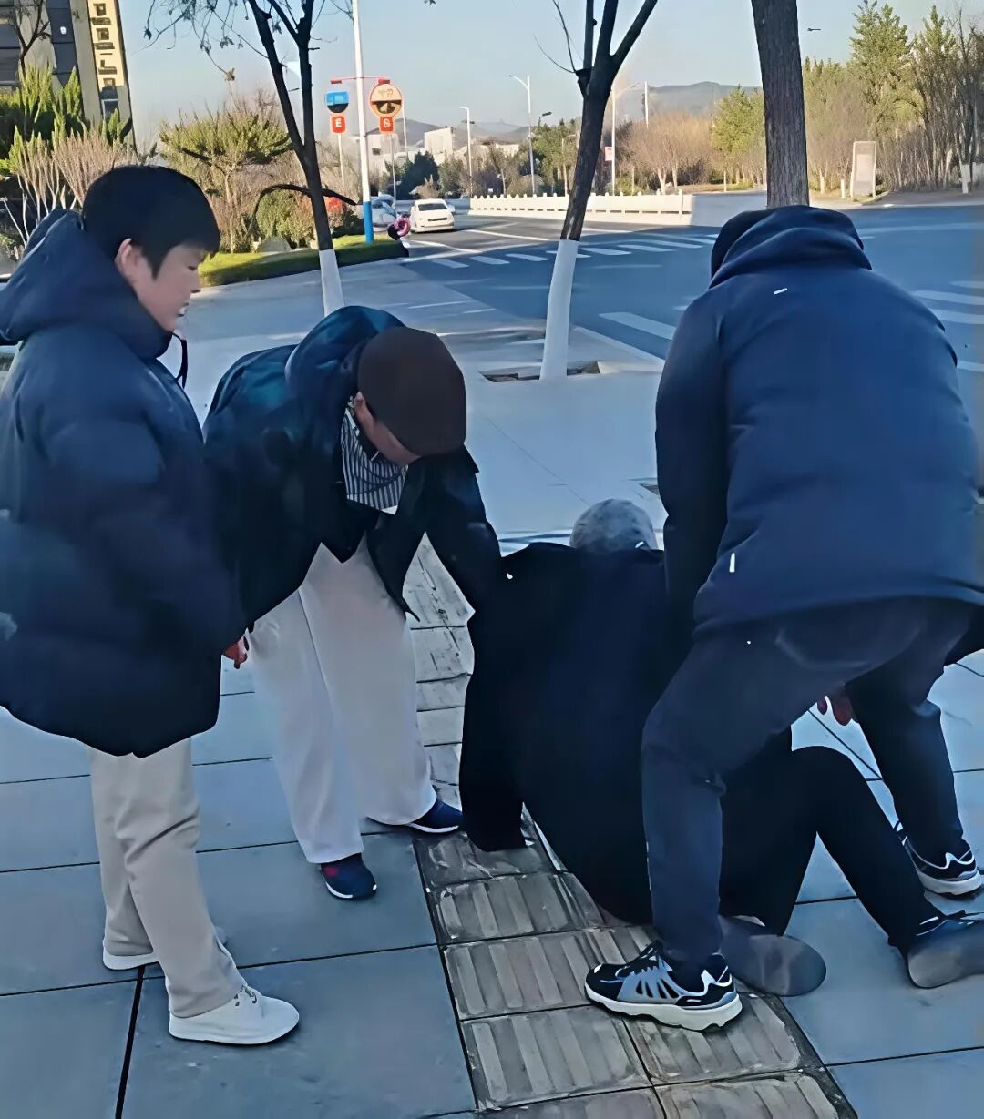 当日室外寒意渐浓,招远市梦芝街道考家社区阳光家苑党群服务站工作人员李根浩、杜秀琳、范丽华在小区东门清理道路两侧小广告时,发现一名老人不慎摔倒在人行道上。三人立即上前查看,发现老人言语含糊,脸部伴有出血,情况十分紧急。