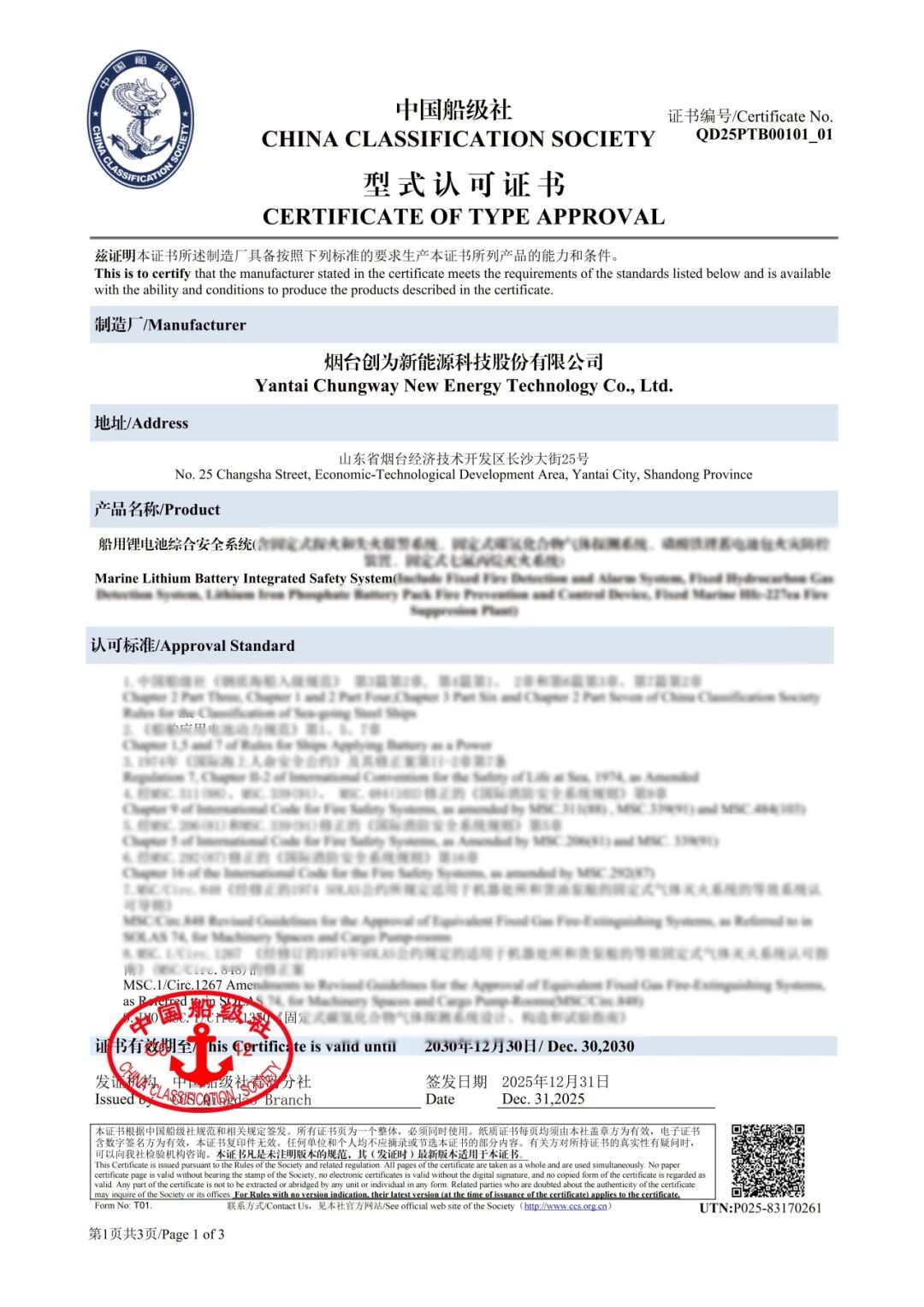 新年伊始,烟台黄渤海新区就传来一条创新喜讯——日前,中国船级社(CCS)向新区企业烟台创为新能源科技股份有限公司(简称“创为科技”)发放了国内首张“船用锂电池综合安全系统”型式认可证书,标志着船舶行业在新能源安全应用上迈出里程碑式一步。
