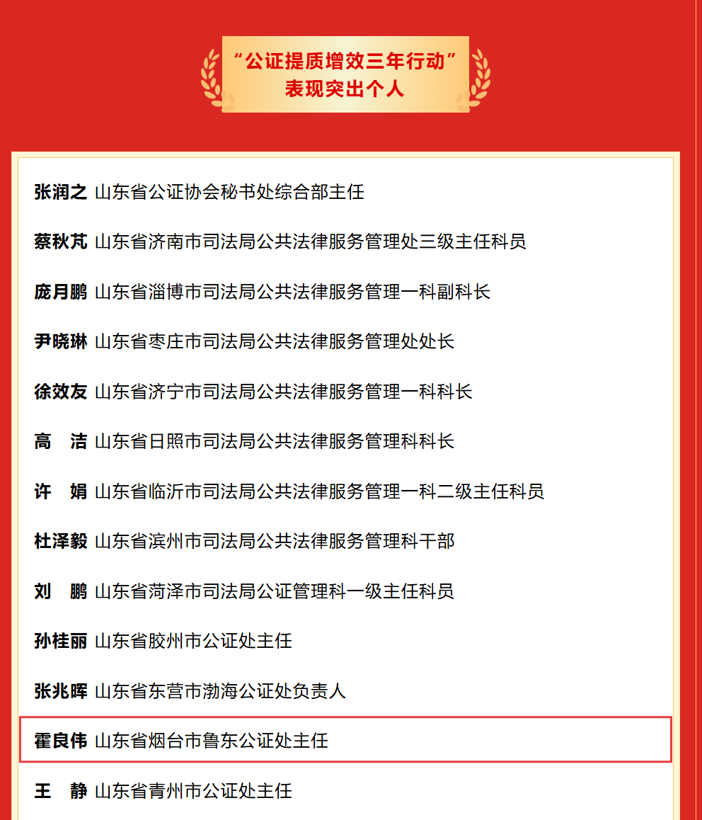 近日,司法部印发《关于通报表扬“公证提质增效三年行动”表现突出集体和个人的决定》(以下简称《决定》),山东省共有9个集体、20名个人获通报表扬,其中烟台市司法局被司法部评为“公证提质增效三年行动”表现突出集体,烟台市鲁东公证处主任霍良伟被司法部评为“公证提质增效三年行动”表现突出个人。