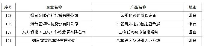 此次入选企业的核心产品覆盖高端装备、汽车、储能等多个关键产业领域。烟台金鹏矿业机械有限公司的“智能化选矿成套设备”锚定高端装备赛道,东方旭能(山东)科技发展有限公司的“云控低碳智冷储能系统”深耕储能领域,烟台正海科技股份有限公司的“车载用外挂式触控显示屏”与烟台霍富汽车锁有限公司的“汽车进入及识别认证系统”则深度赋能汽车产业。