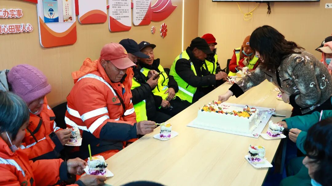 印有“暖冬护‘新’·情系职工”字样的巨型蛋糕被缓缓推出,工会干部与劳动者代表共同切下甜蜜瞬间,并将这份冬日的甜蜜与祝福传递给现场的每一个人,以食物为载体,传递出工会对劳动者的尊重与感谢,进一步增强了群体的归属感和凝聚力。