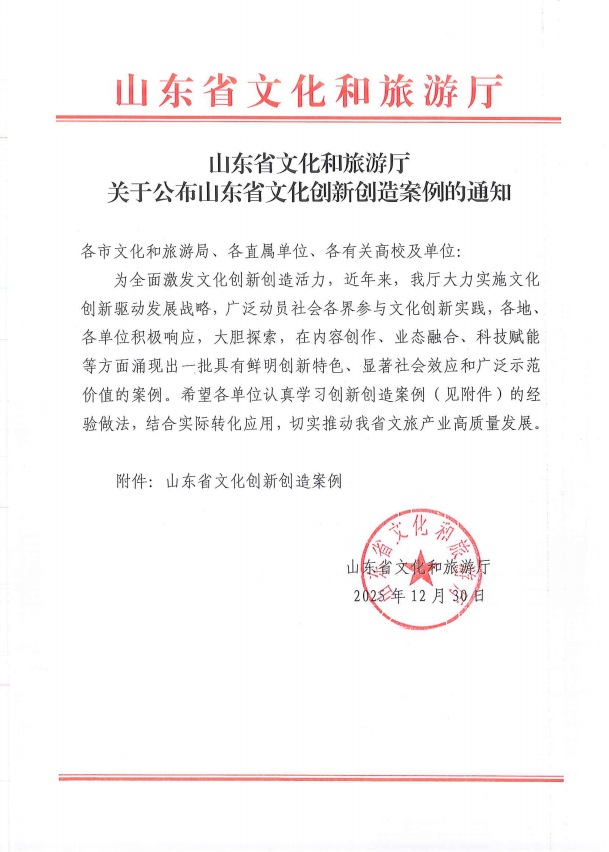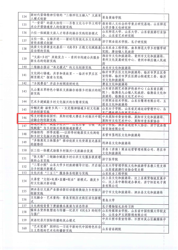 近日,山东省文化和旅游厅公布了山东省文化创新创造案例,由莱阳市委宣传部、莱阳市文化和旅游局、莱阳市文化艺术中心、莱阳市音乐家协会联合申报的《唱支村歌给祖国听:莱阳村歌大赛在乡村振兴中联动融合的创新实践》荣耀上榜,这是莱阳村歌大赛继入选山东省文化和旅游厅第一批山东省文化和旅游高质量发展创新典型做法、农业农村部《大地流彩 全国乡村文化振兴在行动典型案例选编》、文化和旅游部全国公共文化发展中心和中国文化馆协会2025年全国乡村文化专题活动培训班优秀案例之后的又一重磅荣誉!
