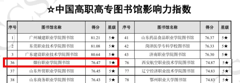 日前,武汉大学中国科学评价研究中心等机构发布《数智时代中国图书馆影响力指数报告2025版》,烟台职业学院图书馆获5星影响力评级,全国高职高专图书馆排名从第80位跃升至第36位,连续3年实现跨越式发展,稳步跻身全国前列、省内第一梯队。