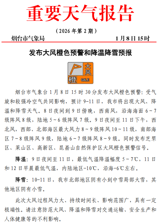 受气旋和较强冷空气共同影响,预计9-11日,我市将出现大风、降温和降雪天气。8日夜间到9日傍晚,西南风,沿海海面6~7级阵风8级,陆地5~6级阵风7级。9日夜间至11日下午,西北风,西部、北部海区最大风力8~9级阵风10~11级,南部海区7~8级阵风9级,陆地6~7级阵风8~9级。同时发布芝罘区、莱山区、高新区、昆嵛山自然保护区大风橙色预警信号。
