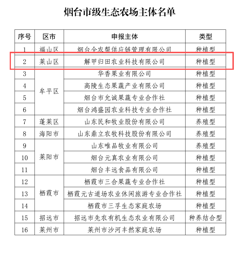 近日,烟台市农业农村局正式公布2025年度市级生态农场评审结果名单。全市共16家农业经营主体被授予“烟台市级生态农场”称号。其中,莱山区解甲归田农业科技有限公司(云谷农场)光荣上榜!