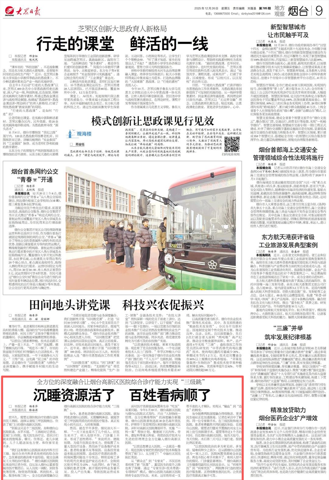 “以前医院收治的多为常见病、多发病,疑难病种少之甚少,自从跟烟台山医院成为一家人之后,医院闲置资源被全面盘活,再也不担心有手术做不了、有病人留不住的情况,门诊量显著增加。”烟台高新区卫生健康局副局长刘京波表示,从“病有所医”到“病有优医”,两院携手打造的便民医疗服务圈,正持续释放惠民红利,让优质医疗资源真正触手可及。