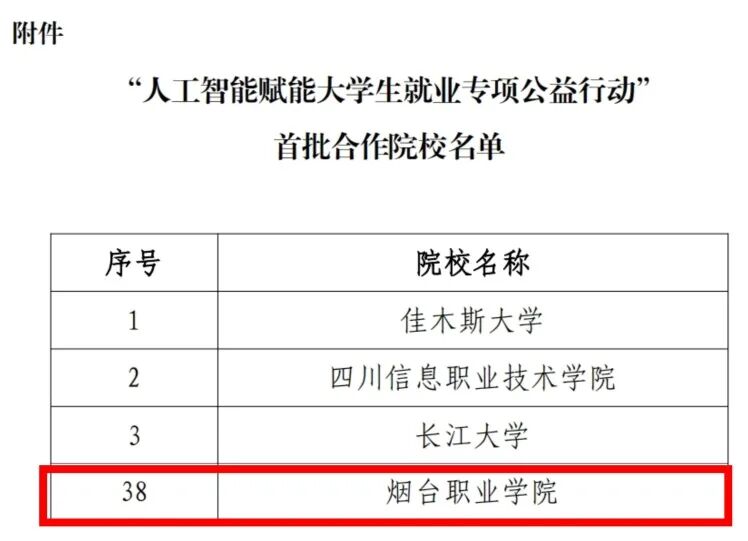 近日,高校毕业生就业协会公布了关于“人工智能赋能大学生就业专项公益行动”首批合作院校名单,经自主申报、资格审查,确定50所首批合作院校,烟台职业学院入选。