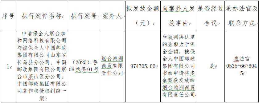 为进一步严格执行案款管理,规范执行案款发放程序,确保执行案款发放安全,根据最高人民法院《关于执行款物管理工作的规定》等相关规定要求,现对以下执行案款发放事宜进行公示,公示期为三个工作日(2026年1月12日-1月14日),案件当事人或者其他利害关系人如有异议应当在公示期内提出并提交相关证据材料,公示期满无异议的,本院将按照执行案款管理的相关规定办理发放手续。