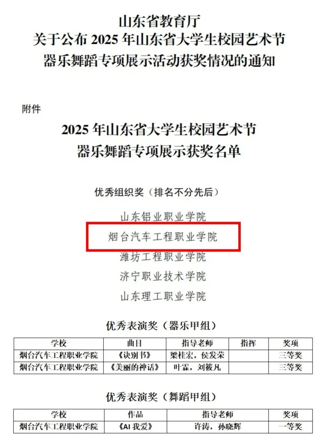 近日,由山东省教育厅主办、鲁东大学与山东教育电视台联合承办的2025年山东省大学生校园艺术节器乐舞蹈专项展示活动获奖名单正式公示。烟台汽车工程职业学院选送的3项作品凭借扎实的美育教学成果与师生的出色表现,斩获优秀组织奖、舞蹈甲组优秀表演奖一等奖、器乐甲组优秀表演奖三等奖两项的好成绩。