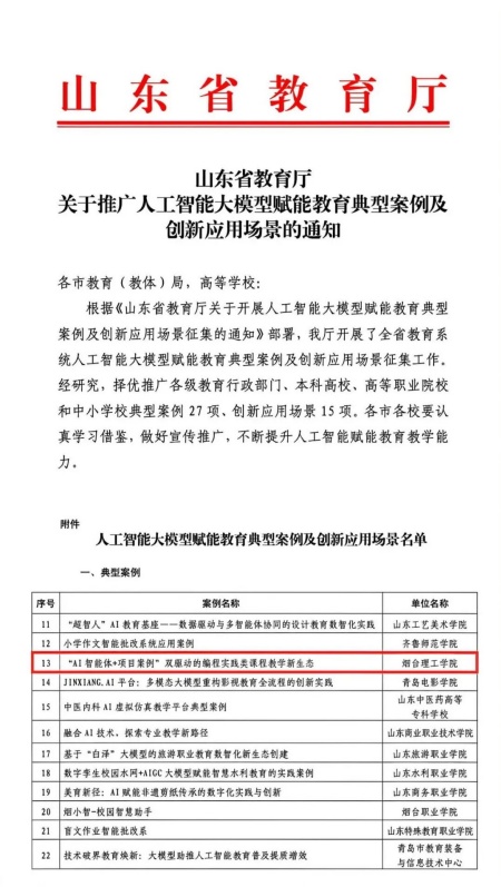 近日,山东省教育厅公布了人工智能大模型赋能教育典型案例及创新应用场景评选结果。烟台理工学院迟殿委老师主持申报的案例《“AI智能体+项目案例”双驱动的编程实践类课程教学新生态》成功入选山东省人工智能大模型赋能教育典型案例及创新应用场景名单,标志着烟台理工学院在人工智能赋能教育教学改革方面取得新的重要突破。