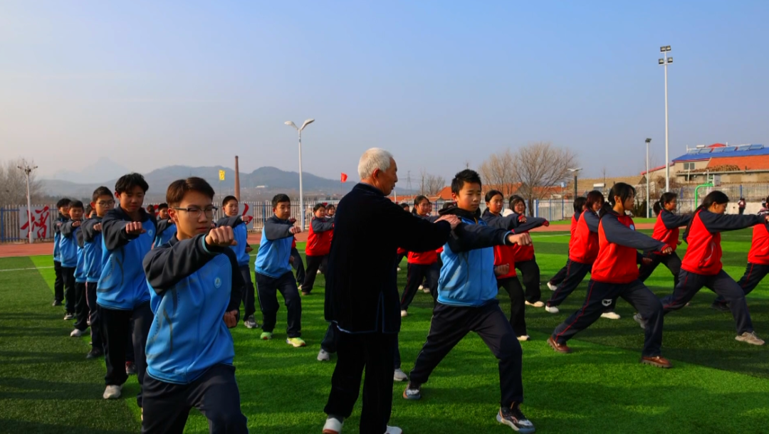 “骑马登山式,前蹬后绷,挺胸收腹,胳膊端平……”在栖霞市松山中学的操场上,王云民一边讲解一边示范,孩子们跟着他一招一式学得有模有样。