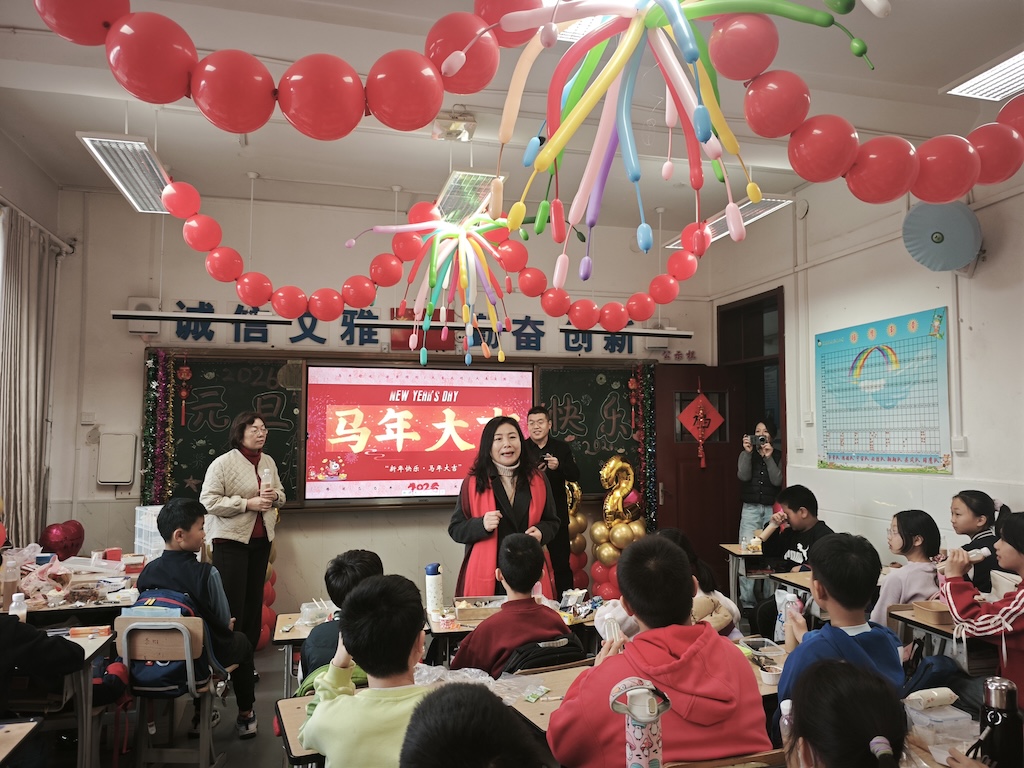 活动当天,各班教室张灯结彩。美食节环节,学生们争相展示与家人一起制作的雪花酥、饺子等美食,从备料到装盘亲力亲为,在劳动中体会幸福。文艺联欢环节践行“让每个孩子都被看见”的理念,不仅多才多艺的学生踊跃登台,腼腆的学生也在鼓励下勇敢亮相,人人都成为舞台焦点。校长杜家盛带领学校相关领导走进各班,认真倾听学生新年愿望,送上真挚祝福。最后,全体师生共同观看了红色电影《志愿军》。