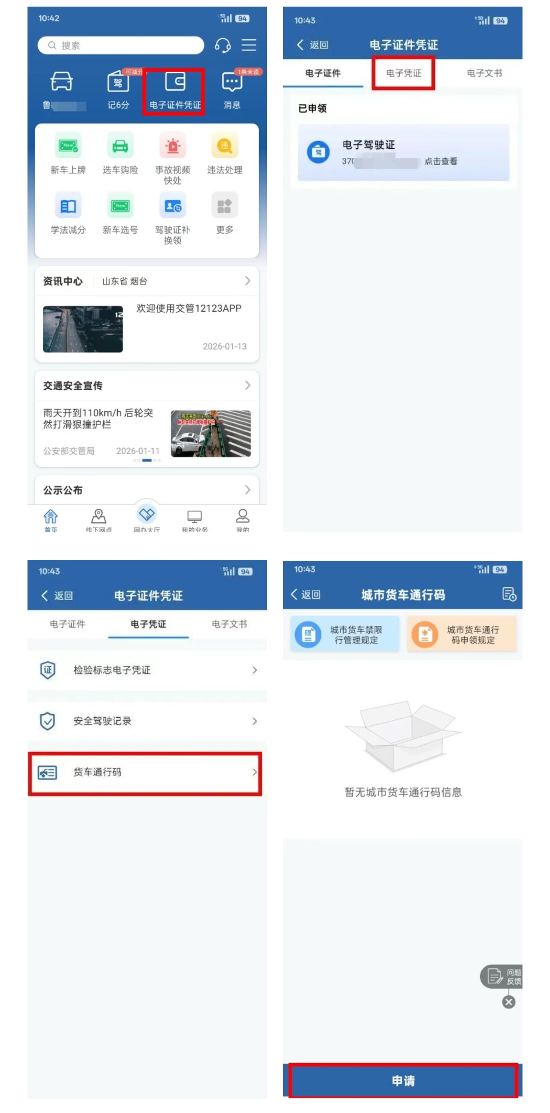 1.在交管12123APP备案绑定车辆后,登录交管12123APP→电子证件凭证→电子凭证→货车通行码→阅读城市货车禁限行管理规定及申领规定→申请货车通行码。