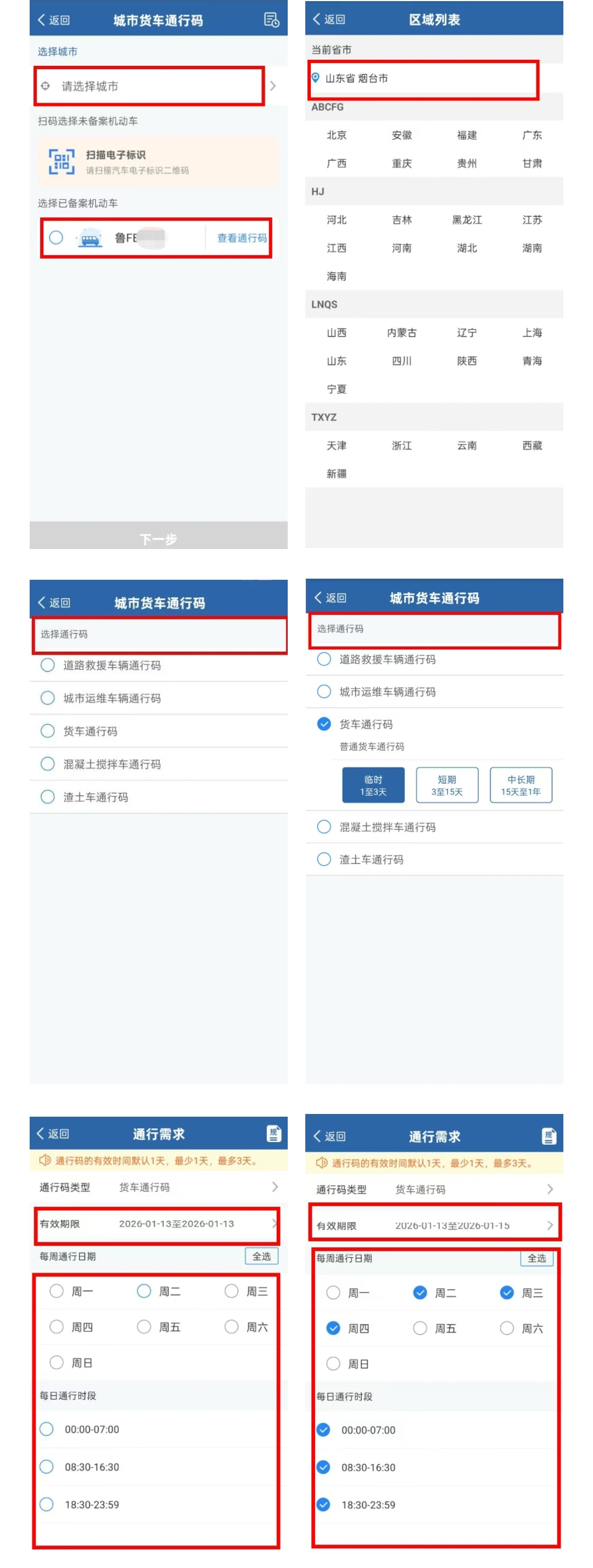 2.选中需要办理的通行码的车辆和城市→选择通行码类型→选择通行码日期及时段。