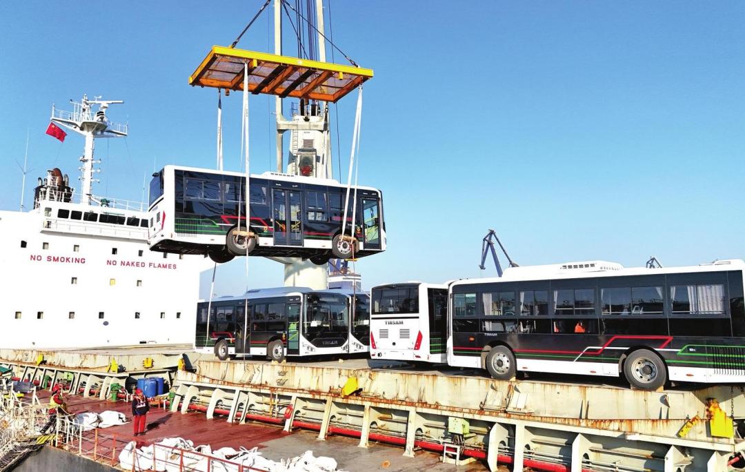 1月12日,170余辆国产公交车在山东港口烟台港装船,即将发往非洲。