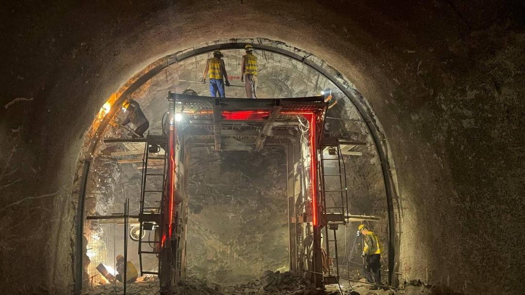 “铿锵铿锵……”掘进机操作手柯军平盯着控制屏,操控着身形庞大的悬臂掘进机一点点向前掘进,围岩被挤压成碎渣,待装载机、渣土车进场拉完渣土,后组施工人员随即上前,安装钢拱架、喷涂混凝土,以保证围岩安全。