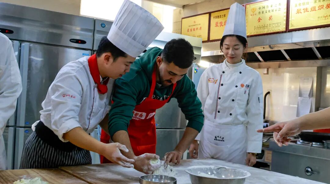 在实践体验环节,中餐专业教师徐立文现场演示了经典鲁菜的全套制作工艺。从精准刀工到火候拿捏,从五味调和到艺术装盘,每一个步骤都彰显出鲁菜技艺的严谨与传承。同学们在教师的指导下亲手尝试,在操作中真切体会到中国烹饪“和合之美”的独特魅力。面点专业教师米国红展示了精湛的拉面技艺,面团在他手中化作缕缕细丝,引来现场阵阵赞叹。在国际学生与我校志愿者“手拉手”的协作互动中,大家亲身体验了从揉面到成型的全过程,共同感受中国面点文化的灵动与精妙。