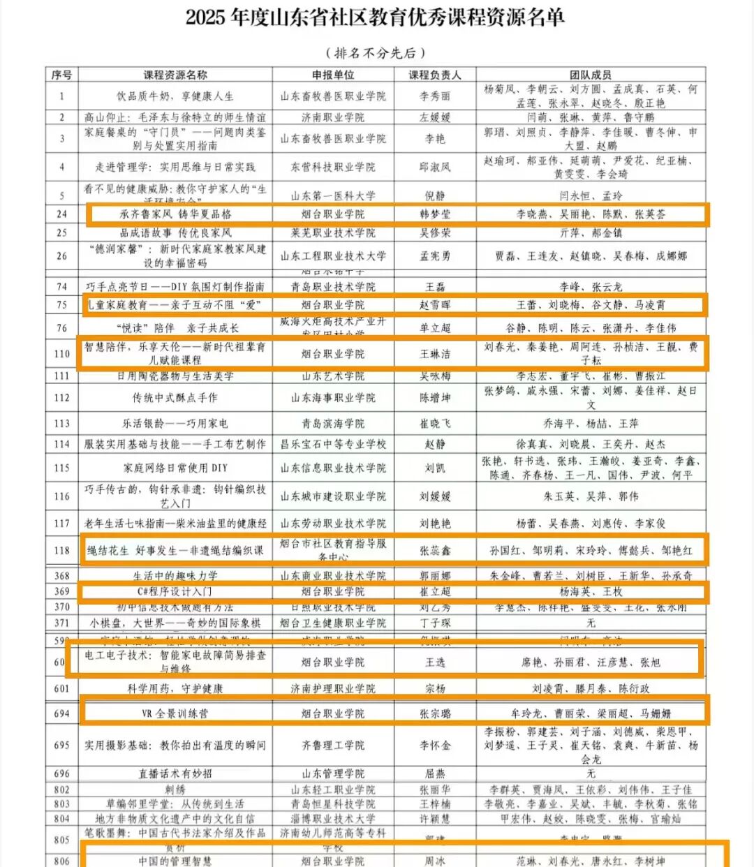 近日,山东省教育厅公布2025年度社区教育优秀课程资源遴选结果,烟台职业学院8门社区教育课程资源入选,彰显了学校在推进校地协同育人、服务终身教育体系建设方面取得的扎实成效。