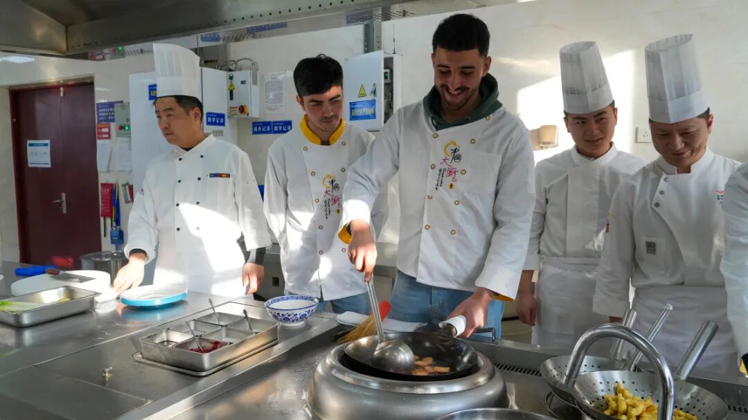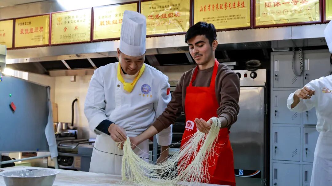 在实践体验环节,山东城市服务职业学院中餐专业教师徐立文现场演示了经典鲁菜的全套制作工艺。从精准刀工到火候拿捏,从五味调合到艺术装盘,每一个步骤都彰显出鲁菜技艺的严谨与传承。同学们在教师的指导下亲手尝试,在操作中真切体会到中国烹饪“和合之美”的独特魅力。面点专业教师米国红展示了精湛的拉面技艺,面团在他手中化作缕缕细丝,引来现场阵阵赞叹。在国际学生与山东城市服务职业学院志愿者“手拉手”的协作互动中,大家亲身体验了从揉面到成型的全过程,共同感受中国面点文化的灵动与精妙。