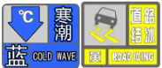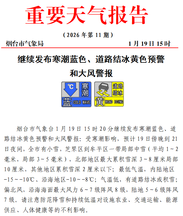19日15时,烟台市气象台继续发布寒潮蓝色、道路结冰黄色预警和大风警报。