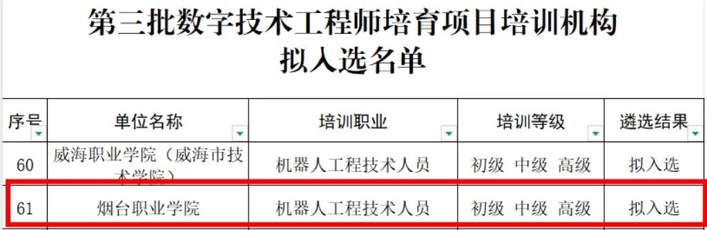 近日,山东省人力资源和社会保障厅公布《关于公示我省第三批数字技术工程师培育项目培训机构拟入选名单的公告》,烟台职业学院申报的机器人工程技术人员(初级、中级、高级) 职业培训项目入选。