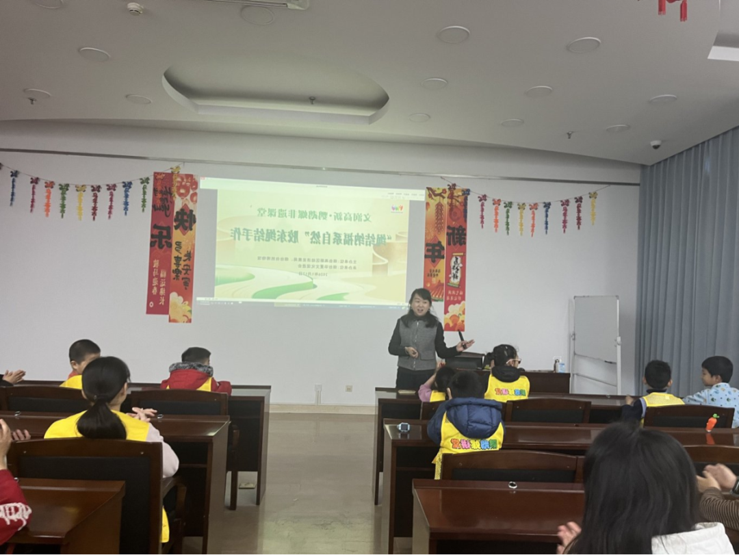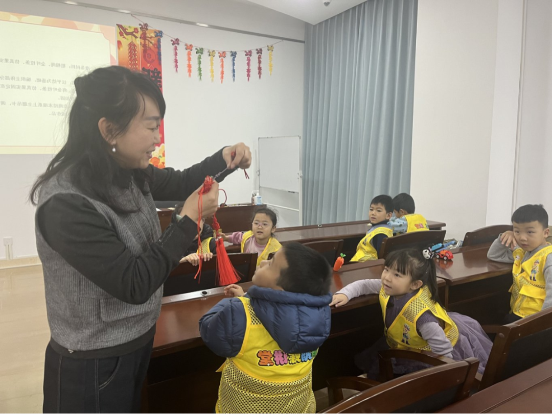 随后,大家走进科普活动室,非遗体验环节在温馨愉悦的氛围中展开。指导老师向大家介绍中国绳结艺术的历史与文化内涵,并演示“纳福结”的基础编法。孩子们与家长携手,将一根根彩绳编织成寄托美好祝愿的结饰。“绳结不仅是手艺,更是连接自然材料与内心祝福的纽带。”老师一边指导一边讲解,“我们从自然中获取材料与灵感,也将对生活的热爱与祈愿编入其中。”现场笑语盈盈,绳结在指尖穿梭,文化与情感在亲子协作中静静流淌。