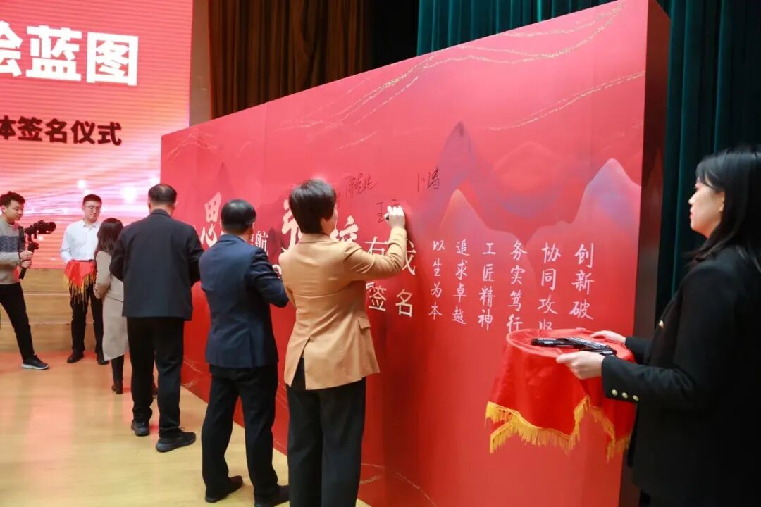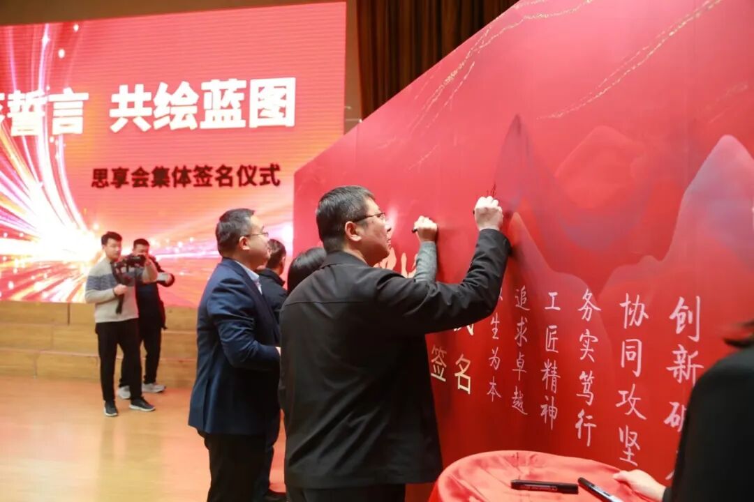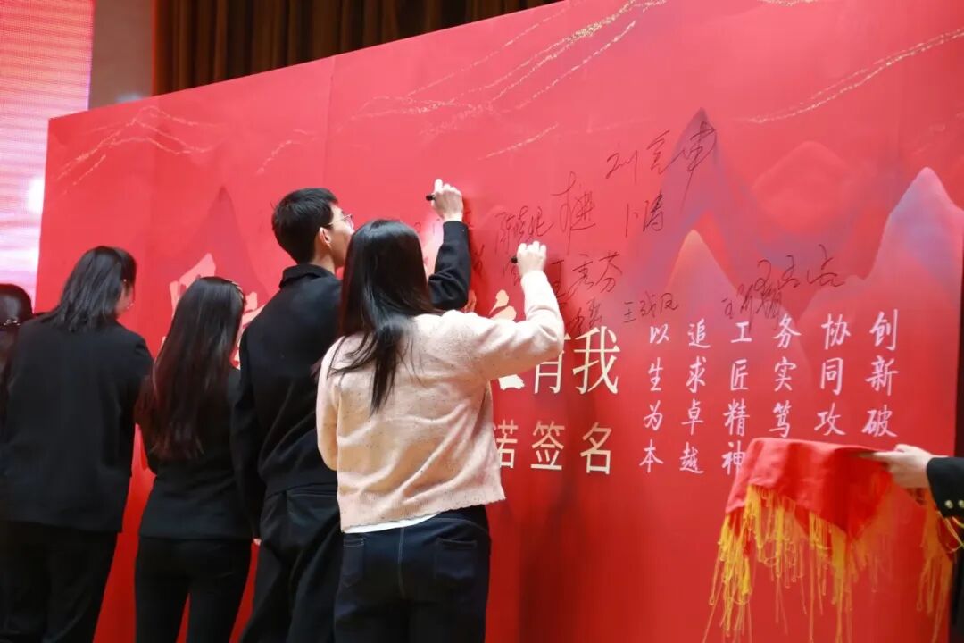 大会举行了庄严的授旗仪式和签名仪式。院长郭峰为“灯塔”“砺刃”“聚力”“铸魂”四支思享先锋队授旗,勉励大家将旗帜象征的使命转化为扎实行动与成果。导师、青年干部和优秀教师代表在签名卷轴上郑重署名,承诺以智慧与担当共绘发展蓝图。在青年代表领誓下,全场齐声宣誓:“烟汽青锋——思享同行!赋能发展——青年先行!”誓言铿锵,展现昂扬斗志。