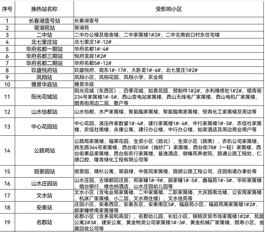 1月20日夜间,我公司供热核心设备2#、3#锅炉于突发故障,致城区部分换热站无法正常运行,公司第一时间启动应急预案,由技术骨干组成专项抢修组进行抢修作业,同时启用两台备用燃气锅炉进行辅助供热。目前,3#锅炉已于1月21日6:30抢修完毕开始启动,2#锅炉预计1月22日上午10:00点前完成抢修。抢修期间,部分小区用户家中供暖温度将会受到影响(详见附件)。