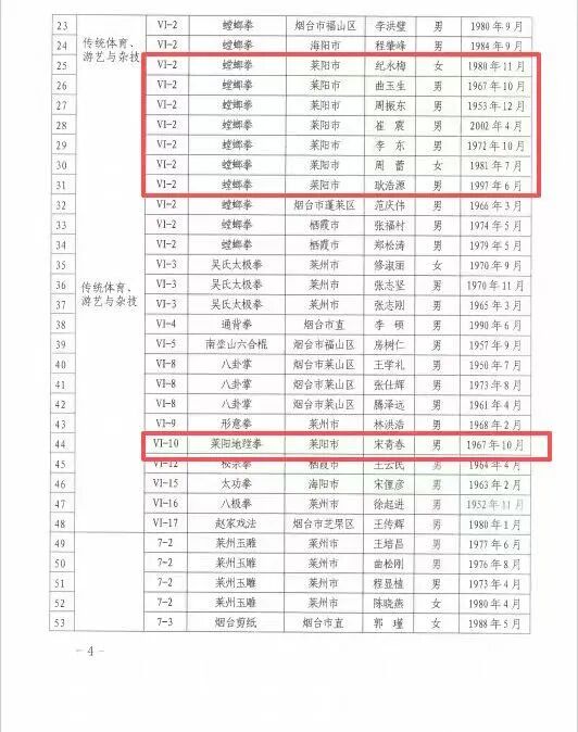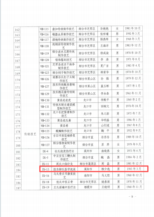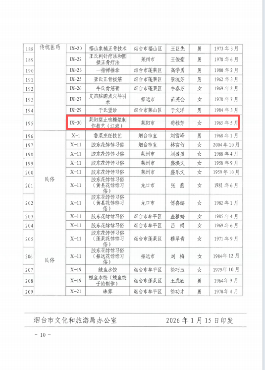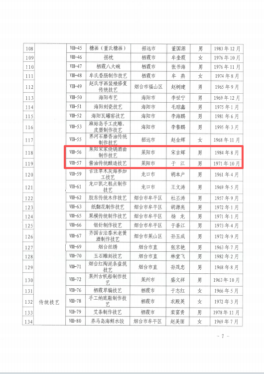 近日,烟台市文化和旅游局公布了第七批烟台市级非物质文化遗产代表性传承人名单。莱阳市共有19名传承人成功入选,入选人数在烟台市各区市中名列前茅。至此,莱阳市域内烟台市级非遗传承人总数增至39人,传承人才梯队建设取得阶段性成果。