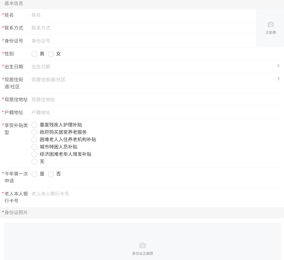 根据页面提示,完整、准确地填写老人及相关信息。