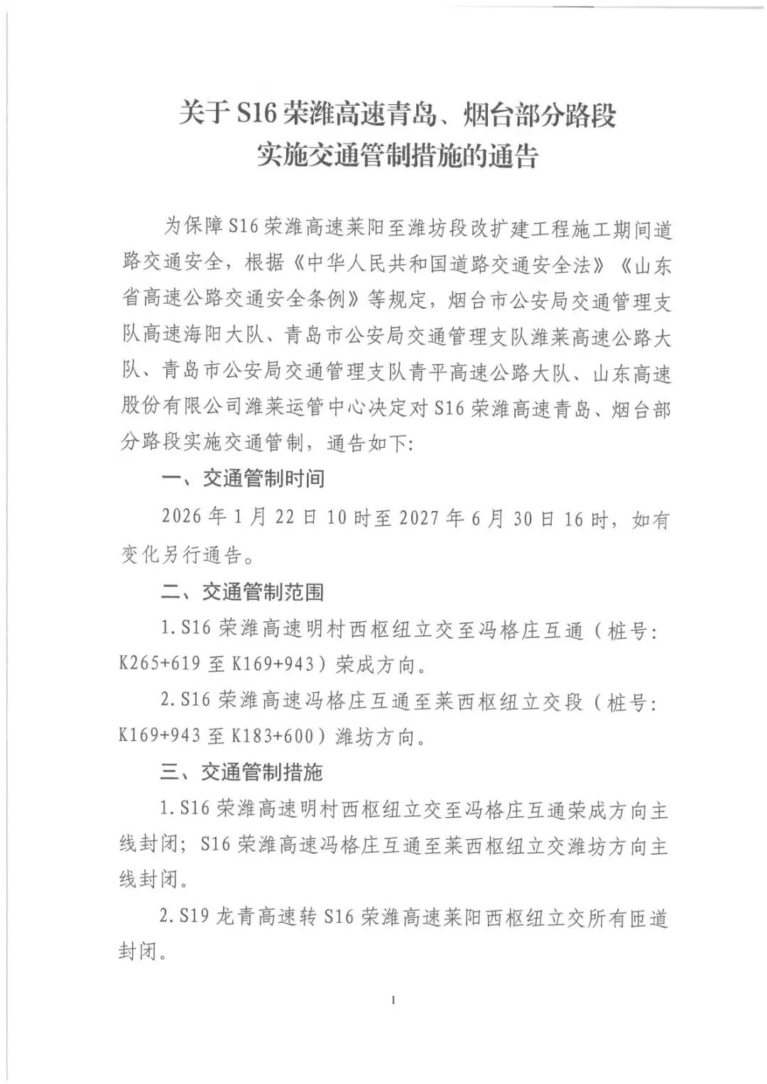 1.S16荣潍高速明村西枢纽立交至冯格庄互通荣成方向主线封闭;S16荣潍高速冯格庄互通至莱西枢纽立交潍坊方向主线封闭。