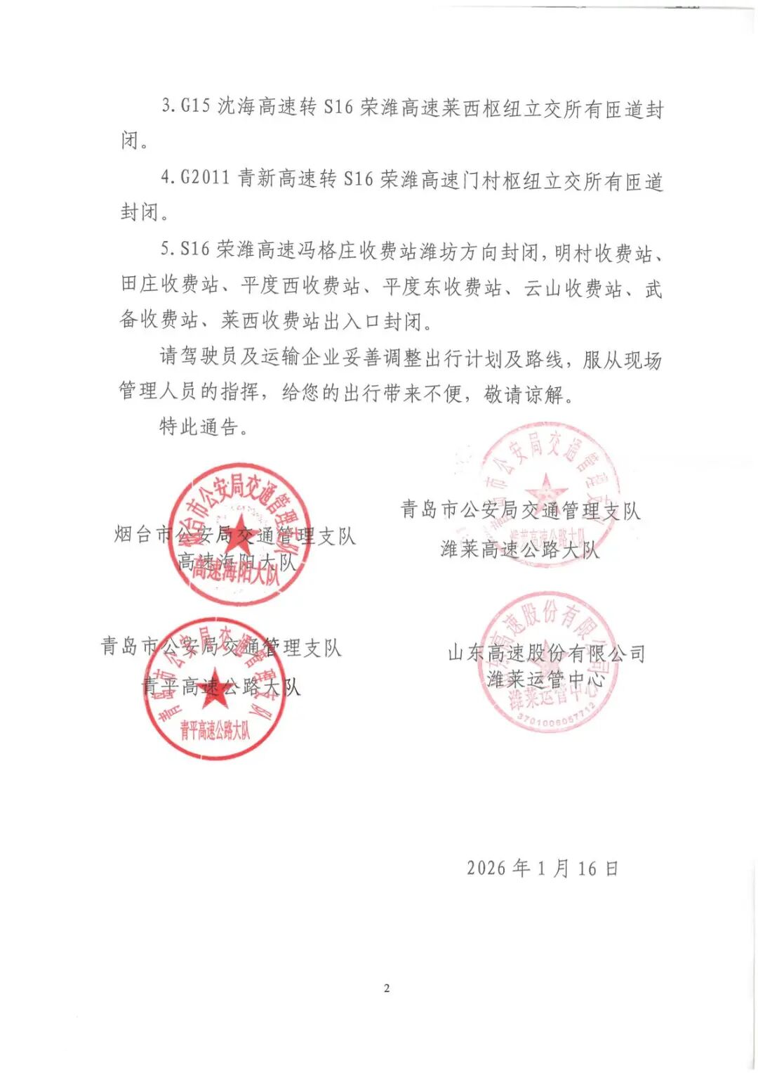 5.S16荣潍高速冯格庄收费站潍坊方向封闭,明村收费站、田庄收费站、平度西收费站、平度东收费站、云山收费站、武备收费站、莱西收费站出入口封闭。