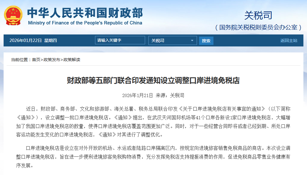 口岸进境免税店是设立在对外开放的机场、水运或者陆路口岸隔离区内,按规定向进境旅客销售免税商品的商店。本次设立调整口岸进境免税店,旨在进一步便利进境旅客免税购物消费,充分发挥免税店支持提振消费的作用,促进免税商品零售业务健康有序发展。