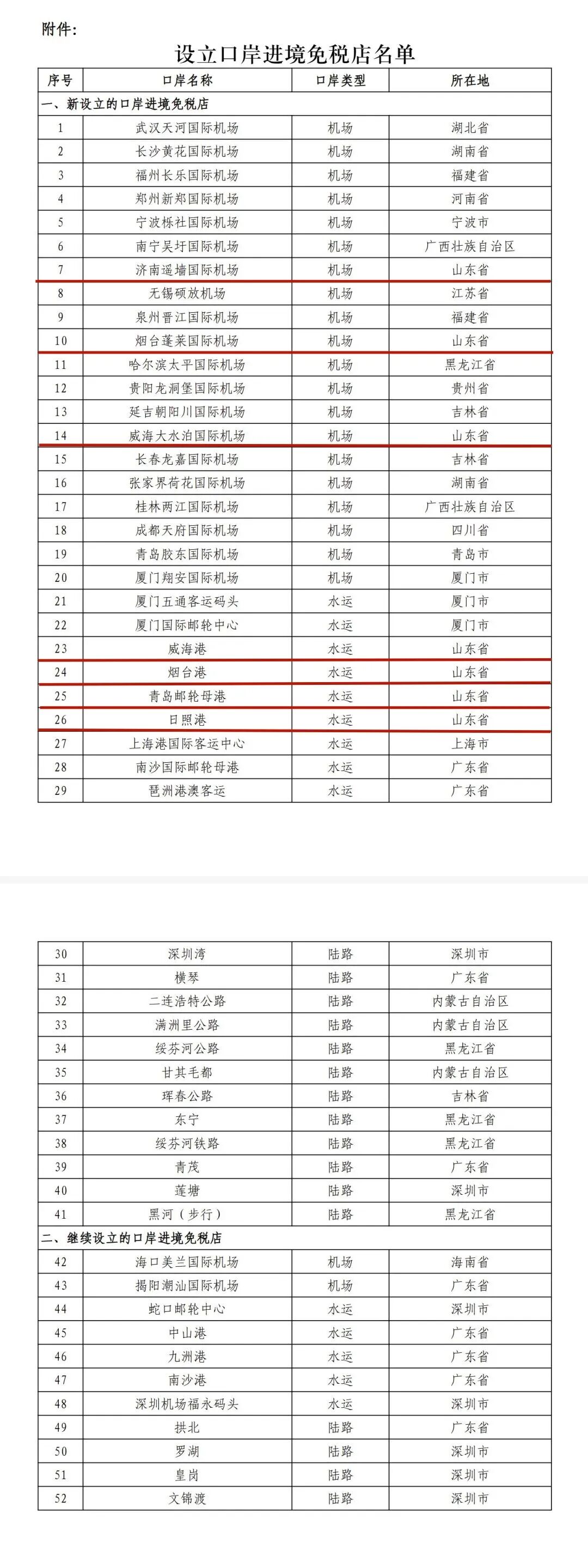二、继续在海口美兰国际机场、蛇口邮轮中心等11个口岸设立口岸进境免税店(在本通知所附《设立口岸进境免税店名单》中为序号42—52)。