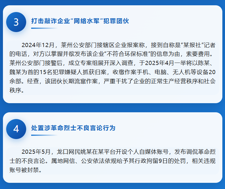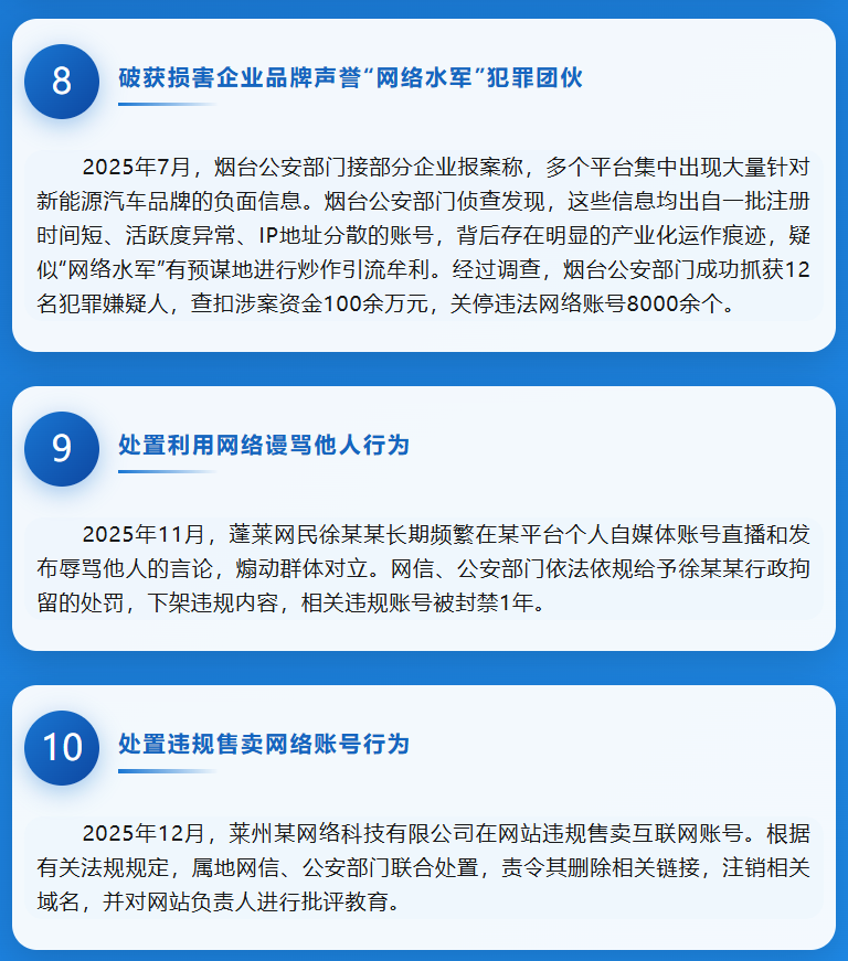 2025年,烟台市深入贯彻落实中央和省委网信部门关于网络综合治理的部署要求,紧紧围绕营造清朗网络空间工作目标,扎实开展“清朗”“净网”等系列专项行动。市直有关部门和县市区依法依规,重拳出击,有效处置和查办了一批具有典型意义的案事件。市委网信办筛选了其中的10起典型案例,现予集中发布,皆在引导广大网民和互联网运营主体,依法上网、依法办网,共同维护清朗网络空间。