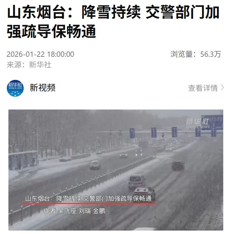 △1月22日,新华社报道《山东烟台:降雪持续 交警部门加强疏导保畅通》