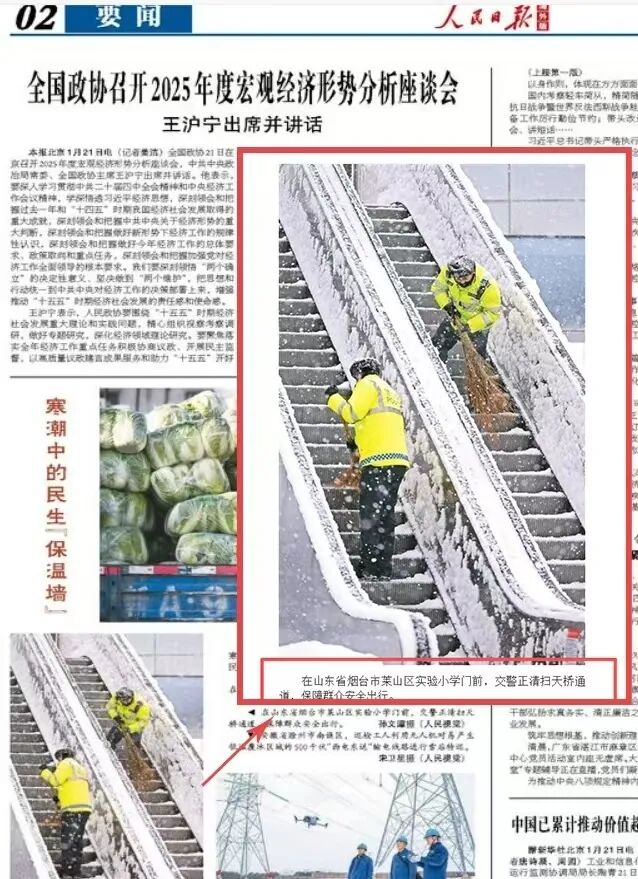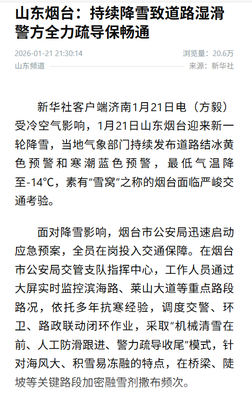 △1月21日,新华社报道《山东烟台:持续降雪致路面湿滑 警方全力疏导保畅通》