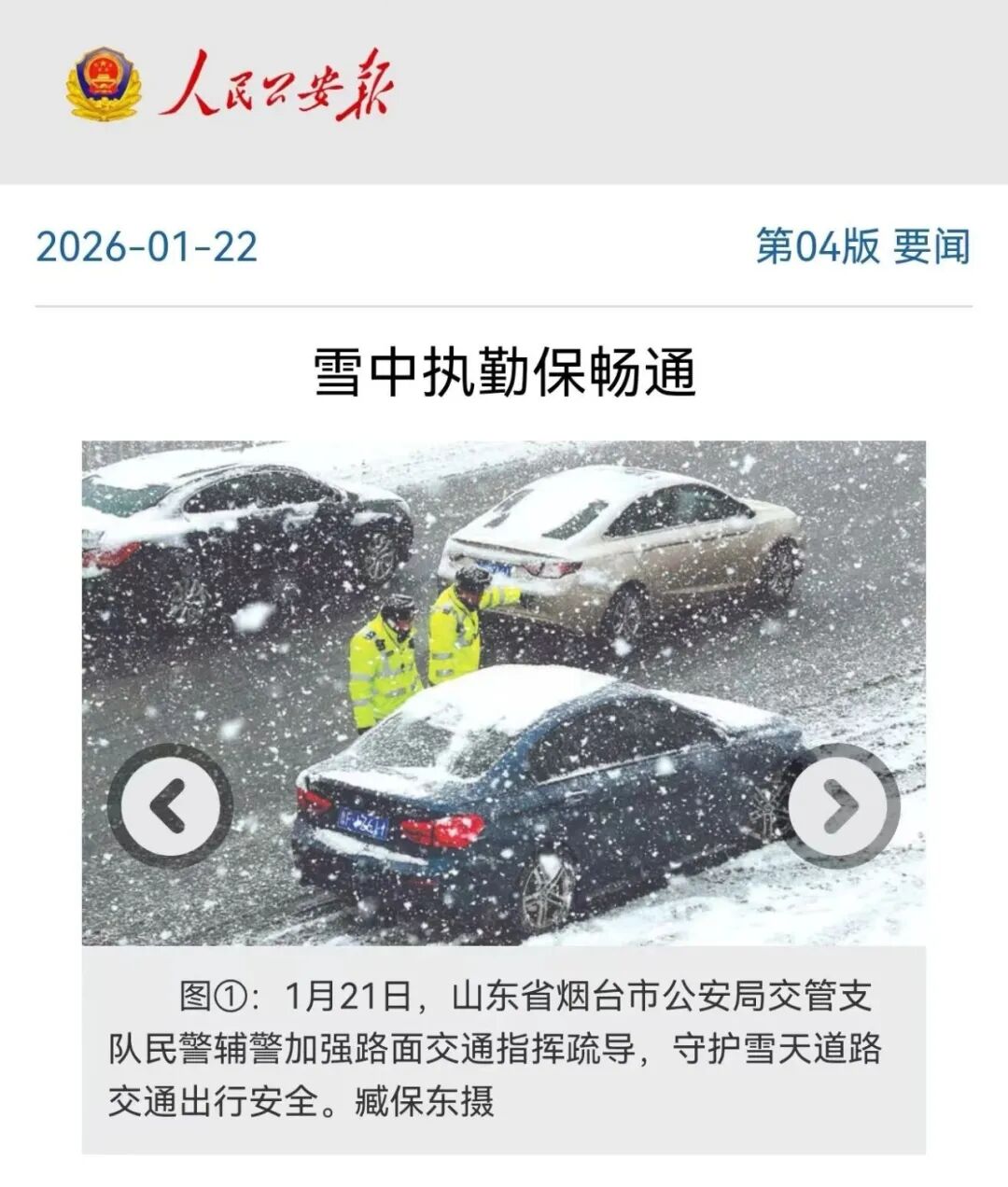 △1月22日,《人民公安报》刊发图片《雪中执勤保畅通》