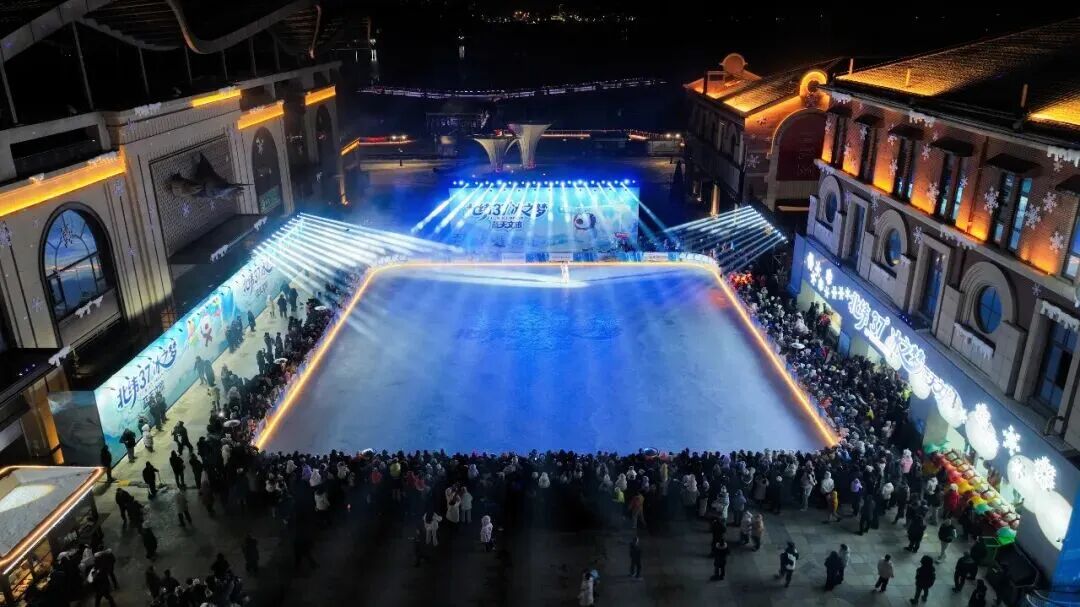 蓝天文旅则以精准的文旅视角,为专业冰场注入多元魅力。“北纬37°冰之梦”坐落于芝罘湾广场核心区域,32米巨型冰场搭配5米巨型苹果熊IP装置,日间活力满满,夜间在灯光秀映衬下化身梦幻冰雪王国。400平方米的综合服务中心提供一站式服务,温暖的休息区与特色美食热饮,让游客在畅滑之余享受“冰火两重天”的惬意,完美融合运动体验与文旅消费。开幕当晚的冰雪大巡游、乐队演出等活动,与冰协的专业表演相辅相成,打造出全民狂欢的冰雪氛围。