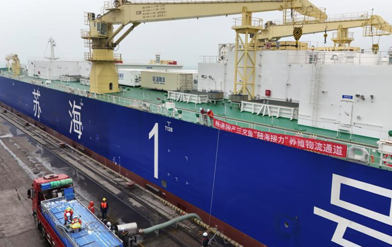近日,全球首艘10万吨级三文鱼养殖工船“苏海1号”抵靠山东港口烟台港,首批16万尾由烟台当地企业培育的优质三文鱼苗成功入舱,搬进了“移动海上牧场”新家。此后,这批鱼苗将被运往适宜海域开展游弋式养殖。
