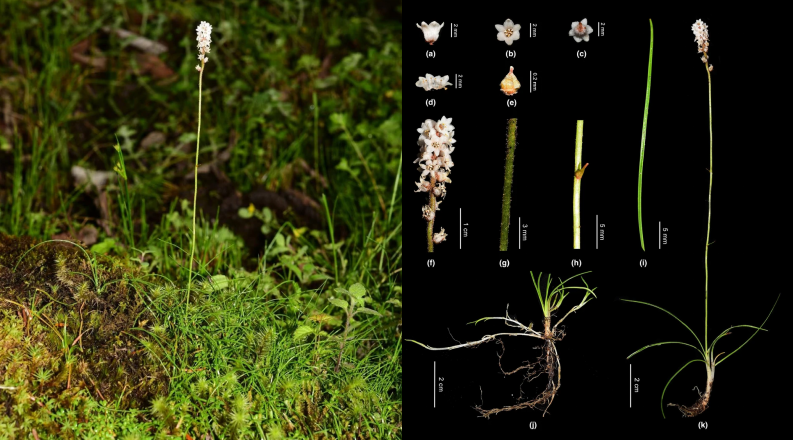 2.墨脱粉条儿菜(Aletris medogensis W.B.Ju, Y.L.Qiu & Bo Xu):该物种属于沼金花科粉条儿菜属,由中国科学院成都生物研究所研究人员发表于《Ecology and Evolution》。研究基于详细的形态比较与叶绿体全基因组序列分析,确定其与高山肺筋草(A. alpestris)亲缘关系最近,但在形态(如花序具腺毛)及基因组结构(如反向重复区边界变异、ycf1基因假基因化等)上存在显著差异,故确立为新种。该多年生草本目前仅知分布于墨脱县高海拔溪流边的有限生境中,由于其种群规模未知,其保护现状被暂评估为数据缺乏。