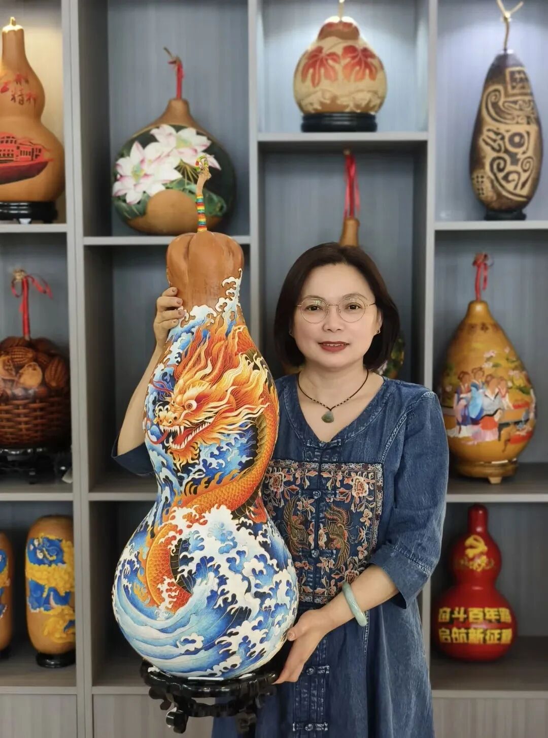 作为成文堂葫芦画第六代传承人、招远第五批非遗传承项目代表性传承人,孙正妍深耕葫芦烙画技艺二十七载,以铁为笔、以火为墨,在方寸葫芦上勾勒万千世界。葫芦烙画又称火笔画,属国家级非物质文化遗产,创作需兼顾立体构图与温度把控,一件作品从选材、画稿到勾线、渲染,需经数十万次低温烙烫,对技艺熟练度与审美水平要求极高。孙正妍潜心钻研,将中国画勾、勒、点、染技法融入烙画创作,更创新融入掐丝工艺,让传统作品焕发当代活力,其作品不仅多次亮相国家、省市级展览,更曾入选中国民间文艺最高奖“山花奖”评选,多件佳作被国内外藏家收藏,部分作品还被带往法国、美国等国家。